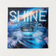 A transparent teacup features two monkeys playing chess inside, positioned beneath a vibrant galaxy where the word "SHINE" sparkles in stars. The teacup sits on a surreal, floating platform of swirling neon liquid, blending classic tea time charm with cosmic wonder and whimsical creativity.