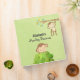 A personalized binder with a cute little monkey swinging from a tree branch. Another monkey is peeking his head out over a green bush. Set on an olive green watercolor background. Personalize with a name and title.