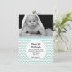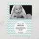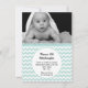Faire-part de naissance bébé photo personnalisée en menthe. Une photo personnalisée pour bébé orne le dessus de la carte plate, avec un motif de chevron blanc et menthe sous la photo. Une zone de texte circulaire blanche, au milieu de l'invitation, a du texte noir personnalisé prêt à être personnalisé. Bonne façon d'annoncer l'arrivée de votre bébé à vos amis et à votre famille.