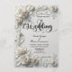 This design features a hyper-realistic digital rendering of baroque scrollwork and blooming white roses, simulating the look of hand-carved architectural plaster. The palette is a sophisticated monochrome study in ivory and cream, with soft grey shadows adding simulated depth to the serrated leaves and vines bordering the layout. Text is arranged in a formal hierarchy, utilizing an elegant black calligraphy script for names paired with a traditional serif font for event details, ensuring high contrast and legibility against the light stone-like background.