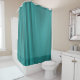 A monochromatic thinly striped pattern set against a light blue background decorates the shower curtain. For customization enquiries please contact info@KBMD3signs.com