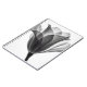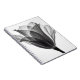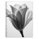 A close-up, monochrome photograph showcases a tulip flower against a bright white background. The flower's petals are delicately rendered, with visible veins adding texture. The image captures the flower from a low angle, emphasizing its upward reach. The stem is slender and dark, contrasting with the lighter petals. The overall mood is serene and elegant, highlighting the flower's natural beauty.