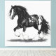 This striking image captures the powerful elegance of a Gypsy Vanner / Irish Cob horse in motion. Rendered in exquisite monochrome, the horse is portrayed with a glossy black coat dappled with white spots, emphasizing the breed's distinctive piebald pattern. Its mane and feathered hooves are flowing with the movement. The image illustrates the Gypsy Vanner strength and grace, making this piece a celebration of the breed's beauty. generativecontent