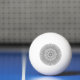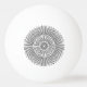 A minimalist white ping-pong ball showcasing a sharp, black-and-white radial burst logo that resembles a stylized iris or sunburst. Positioned on a vivid blue table with a blurred net in the distance, this high-contrast image is perfect for highlighting precision engineering and clean, athletic aesthetics.