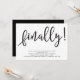 A minimalist typographic invitation for the long awaited engagement. This design features the word "finally!" in bold black hand lettered font and party details in modern sans serif font, all on a white background. The reverse side is in solid black.