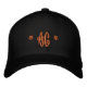 Red monogram embroidered on a hat. Suggested base: white hat.