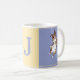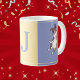Personalize this mug with your own initial, your dog's, or someone else's initial to then give it as a gift. This is a fun, colour block mug featuring a yellow square in between two blueish-purple squares with small lines at the top and bottom (either yellow or white depending on what colour square it is crossing). On either side of the mug is an illustration of an Aussie jumping in the air. In the middle (in the yellow square) is a spot for you to customize with an initial. This makes for a great, custom gift for any dog lover or Australian shepherd owner. It will be a nice, bright, and cheerful addition to your kitchen.