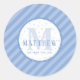 Personalized monogram baby boy round sticker. Custom initial, name and date surrounded by the stars and diagonal stripes. Perfect baby shower or the first birthday favour or gift packaging idea. Traditional pastel baby blue, white and soft khaki colour combo. Add the name and monogram with easy to use Zazzle editing tool! Visit the shop to see all the collection. There are banners, buntings, favour boxes, water bottles, bodysuits and so much more available. And of course, sanitisers and masks are also in the shop!