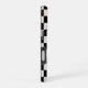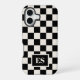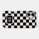 Cool iPhone case features a bold black and cream chequered pattern with a customizable monogram in a black rectangle near the bottom. Add your initials in the sidebar to personalize it. The geometric chequerboard pattern is made of rows of alternating beige and black squares. Other case styles and models are available in the sidebar.
