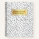 Stylish notebook for your home, office or school with modern black brush strokes polka dots pattern on a silver white background and your initials.