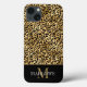 Gold and Black Leopard Spot Pattern Monogram iPhone 13 Case with a white custom name template. Monogrammed Initial Letter iphone case with a jungle cat spotted pattern background.