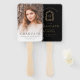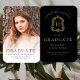 This elegant graduation hand fan features a photo of the graduate with a black text overlay. The word "graduate" appears in decorative outline typography. Add the graduate's name, school and class year below. The back features the word "congratulations" above an elegant vintage crest surrounding a gold monogram initial on a black background, with the name, school and class year below.