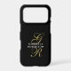 Elegant refined premium look chic iPhone case, personalizable customizable with monogram, initial letters and name. Classy timeless black background, elegant gold calligraphy script handwritten initial letters, and stylish white typography for the name. Beautiful, neutral monochromatic, minimalist minimal simple and useful, for protecting your cellphone or as a thoughtful custom electronic tech accessory gift for her, under 30 dollars For personal use or as a professional business phone case. Suitable as a birthday, Mother’s Day, Christmas, graduation, even retirement present. Or for your company employees for example.