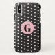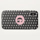 Dress up and protect your iPhone with a polka dots pattern with a round circle design element that is custom monogrammed. Black White and Pink colours. Easily personalize this case with your name/initial/monogram