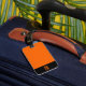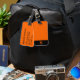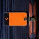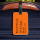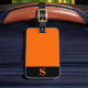 Luggage tag with orange monogram initial(s)/name on a black stripe monogram frame, name, and address information on an orange background. Personalize with your monogram initial(s)/name, name, and address information using the easy templates. Font colour, font style, font size, and orange background colour are customizable.