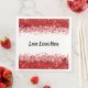 Elevate your dining experience with our exquisite monogram dinner napkins. Each napkin is adorned with the heartfelt message "Love Lives Here" in bold black text, creating a striking contrast against a pristine white background. The top and bottom edges are delicately embellished with a shimmering red glitter border, adding a touch of glamour and sophistication to your table setting.