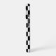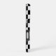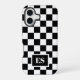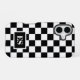 Cool iPhone case features a bold black and white chequered pattern with a customizable monogram in a black rectangle near the bottom. Add your initials in the sidebar to personalize it. The geometric chequerboard pattern is made of rows of alternating white and black squares. Other case styles and models are available in the sidebar.