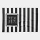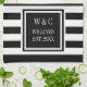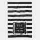 Elegant personalized initials monogram kitchen towel featuring a black and white striped pattern with your initials and family name with your established date set in a black-bordered square with a classic white text. Designed by Thisisnotme©