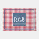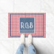 A trendy 24"x36" farmhouse doormat featuring a red & white buffalo check background and elegant white monogram initials on a textured blue denim print frame. Easily change the initials to make it yours using the Template provided. A smaller 18"x24" doormat is also available. Non-slip rubber that won't crack or buckle, this mat resists fading, mould, and mildew and can be easily cleaned with a hose. See "About This Product" at side for more information. TIP: change RGB initials to first and first name initials R&M for a wedding, anniversary, new home gift.