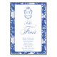 Delft blue floral table number card, designed in a refined blend of chinoiserie and French toile de Jouy style. The soft botanical illustrations frame an arched layout featuring an elegant wedding crest monogram, perfect for couples who love vintage, historic, and European-inspired aesthetics. Classic script typography pairs beautifully with the ceramic-blue palette, making this design an effortless nod to the tradition of “something blue.” Fully customizable with your guest's names, wedding crest and in this design table number: Four, it’s an exquisite choice for any romantic or sophisticated wedding theme.