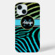 This modern and chic black zebra striped iPhone 15 case has a background colour gradient from yellow to green to turquoise with a turquoise, black, and white band across the middle with a black and green circle on top that has template text for you to personalize with your name in white over your monogram or initial in turquoise. It's perfect for the fun-loving young woman with a style all her own. If you need assistance, email niteowlstudio@gmail.com.