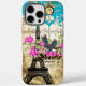 Eiffel Tower Paris France French Aesthetic with Antique Sheet Music Overlay With a Textured Distressed Rustic Faux Parchment Background Trendy Paris the Most Romantic City with a couple of lovebirds hanging out in a blooming tree with elegant pink blossoms tree iphone cases. Pink Blossoms are so romantic in Paris in the spring. Lovebirds hanging out under the Eiffel Tower next to the Beautiful River Seine. Top it off with your Monogram hanging from a bright aqua blue turquoise modern abstract floral element.