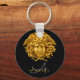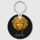 This customizable metal keychain design with black background is a chic custom monogrammed copy of a golden medusa mask originally created with gilt bronze in France circa 1875 and at one time owned by famed ultra rich financier John Pierpont Morgan. The original mask is now in the collection of the Metropolitan Museum of Art. According to ancient Greek mythology, Medusa, also referred to as Gorgo, was one of the three terrible magical Gorgons, usually depicted as winged humanoid females with live poisonous serpents in place of the hair on their heads. Allegedly anyone who looked into Medusa's eyes was turned into stone.