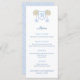 A menu design in light blue and dark blue (with orange accents provided by my own original watercolor illustrations of a stylized orange tree). The pattern on the reverse was created digitally by me. The monogram letter in the crest could be the first letter of the family name or the first name of the honoree (you could also access the design tool and delete this entirely to just leave the tree(s). You can also change the contrast colour on the reverse (currently a light green) by changing the background colour on the reverse side.