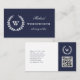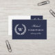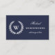 Classic white laurel wreath monogram on dark blue, white custom name and profession on the front side, blue contact info on the back side. Looks elegant, impressive and expensive. Suitable for many professionals (attorney at law used as an example).