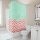 Monogrammed coral pink and mint green design shower curtain. Coral pink and white chevron pattern and mint green and white polka dot pattern.