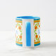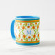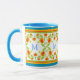 A pretty, floral Ringer Mug to personalize with a monogram or initials, with a border of Pot Marigold flowers, top and bottom and a bright blue lip and handle. Part of the Posh & Painterly 'Marigold Medley' collection.