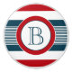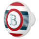 Nautical themed design with monogram decoration in round shape on blue, white and red striped background