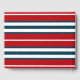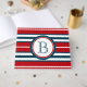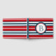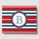 Nautical themed design with monogram decoration in round shape with rope illustration on blue, red and white striped background