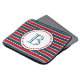 Nautical themed design with monogram decoration in round shape with stars on blue, red and white striped background