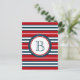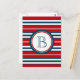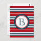 Nautical themed design with monogram decoration in round shape with rope illustration on blue, red and white striped background