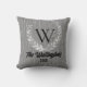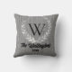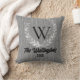 On this Stylish pillow is a grey rustic wood with a letter that you can customize in the centre joined with an elegant silver laurel wreath for extra pop then below that is an area where you can customize it with your name and date. Rustic elegant vibes.