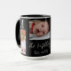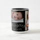 On this stylish black mug is a monogram letter in the corner i then 3 photos with the text in the middle with family name and date where you can customize to your liking with your own photos and family name.