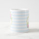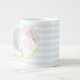 Monogram Fancy Pink Roses Blueberry Jumbo Mug. Fancy floral monogram with roses and blueberry. Very ornate and cheerful, with slightly Victorian or shabby chic look and feel. Pastel colours: pink, blue, green. Light blue stripes. Pink and golden monogram (golden is not real gold but colour).