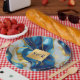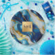 A paper plate featuring a faux gold, blue and white marbled design.