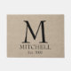 Custom add your own monogram, initial, family name and wedding anniversary or birthday date faux jute linen burlap rustic chic shabby country chic door mat.