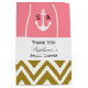 Monogram gold chevron with pink nautical bridal shower thank you gift bag. The design features a metallic gold and white chevron on the bottom half, a pink background with a white anchor with your custom initials on the top half and a white band in the middle with your custom text.