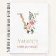 A beautiful monogram notebook with watercolor pink and white flowers, roses and peonies and green leaves and faux gold foil letter "V" with space for name and quote or motto!