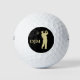 This distinctive golf ball features a gold silhouette golfer in full swing. Your monogram is in matching gold beside it. The text and image are placed on a dramatic black background. Be sure to see the matching golf accessory products in our store.