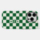 Cool iPhone case features a bold green and cream chequered pattern with a customizable monogram. Add (or delete) 3 initials in the sidebar to personalize it. The geometric chequerboard pattern is made of rows of alternating beige and hunter green squares. Other case styles and models also available in the sidebar.