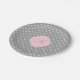 Monogrammed white on grey polka dot pattern with pastel pink accent paper plate. The design features a white and grey polka dot pattern and a pastel pink quatrefoil shape with your custom initial.