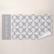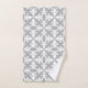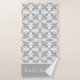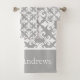 This modern design features a tiled fleur-de-lis pattern in grey and white with a personalized name at the base of the bath towel. Personalize by editing the text boxes provided.