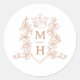 White and rose gold coloured monogram wedding or couples event sticker. Ideal for a white and rose gold themed wedding. Other matching wedding items available. © Monogram crest with a heart crown on top and entwined with berries and leaves original hand drawing and design by Sarah Trett for www.mylittleedenweddings.com exclusively on Zazzle.