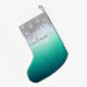 Monogram Script Silver Glitter Holiday Keepsake Small Christmas Stocking with modern turquoise purple ombre and drip glitter. Simply add a name to make this personal by clicking the "Personalize" button