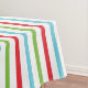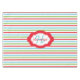 Horizontal stripes of red, white, blue, and green Christmas holiday tablecloth with a centre framed banner of white and red with red text area to add your surname, blue text area to add your monogram initial!