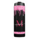 Custom Monogram Black and Metallic bright neon hot pink simulated dripping glitter sparkle paint personalized thermal tumbler, with elegant calligraphy script and chic, minimalist sans serif fonts.